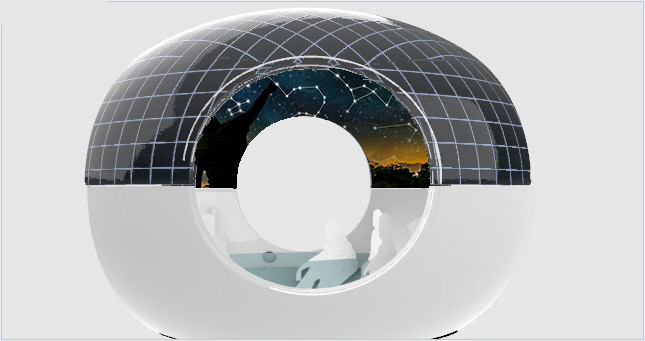 Thinking of 'Constellation' - people tend to use the hot tub after work or at the end of the day, and look up at the sky while they are enjoying the hot tub. I wanted to bring this experience to the hot tub with four different sides of the windows to view yet still has a cover on top with solar energy.